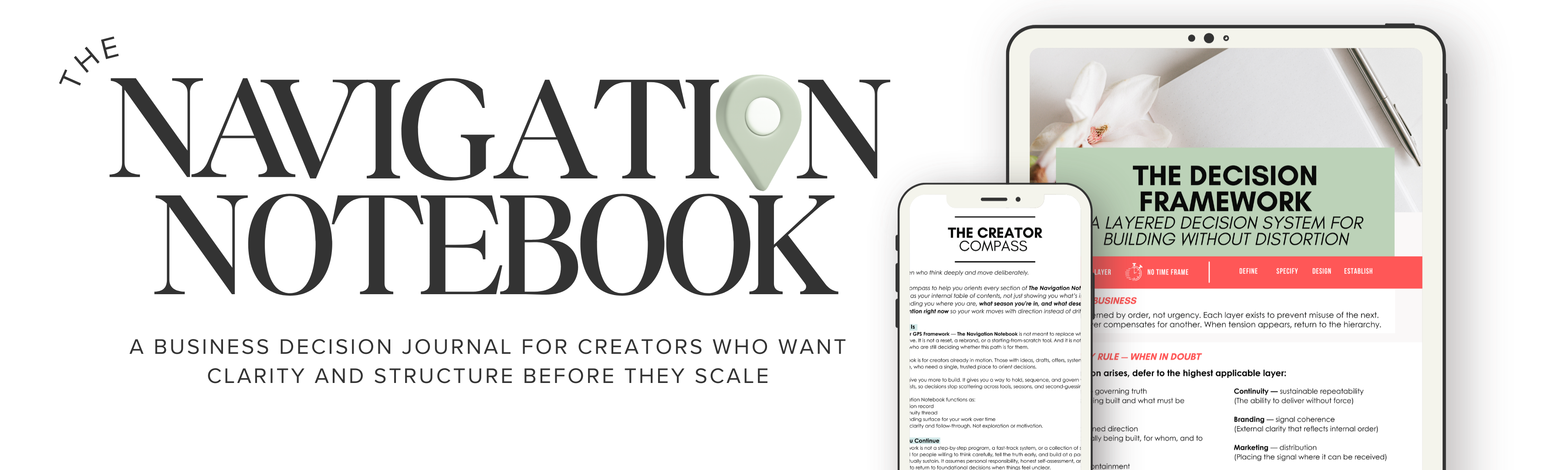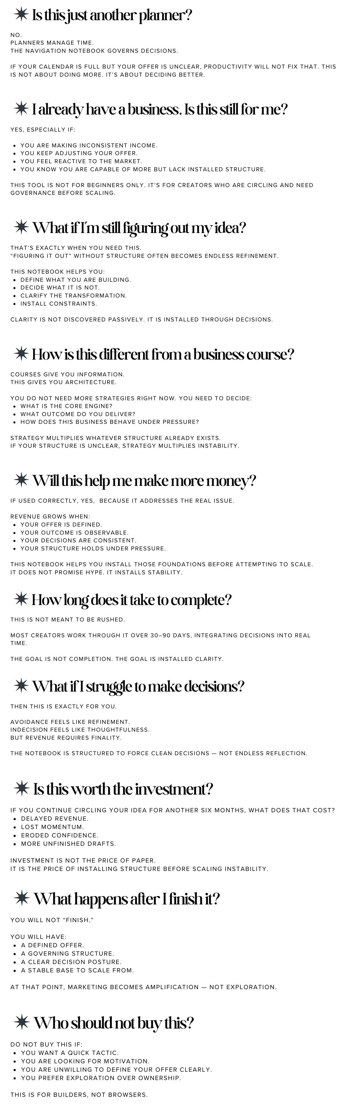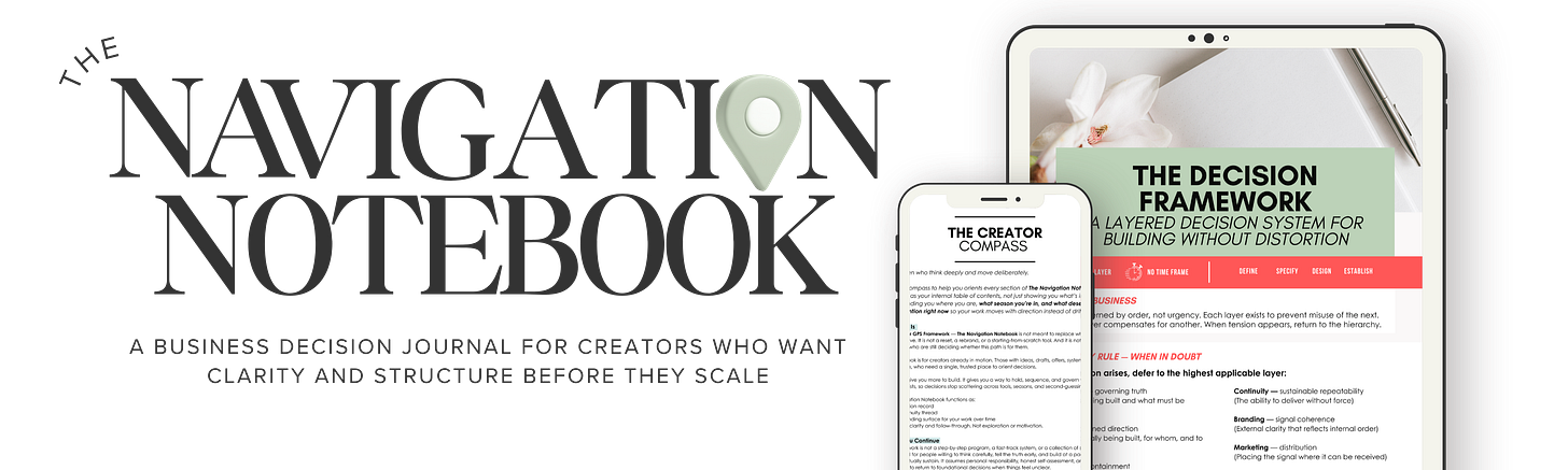 The Navigation Notebook is a structured business decision journal. A digital governance tool. 12 sections. Worked through over 30–90 days as you build.